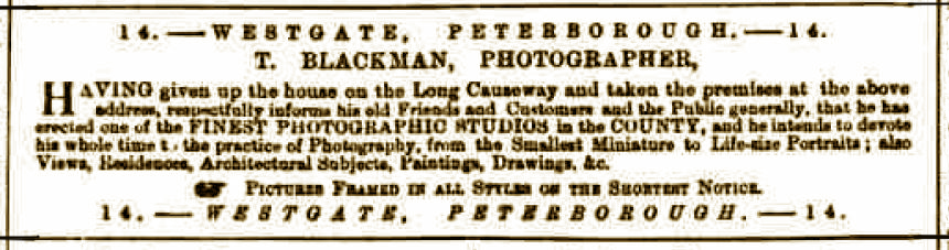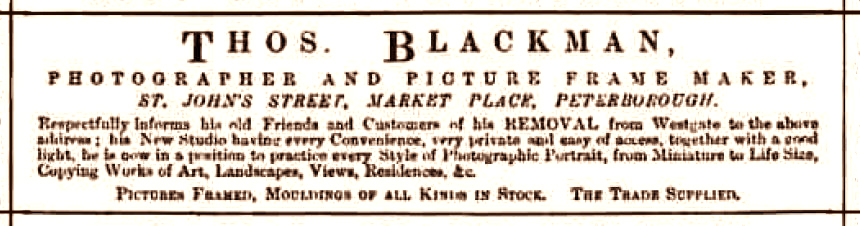 In July 1874, the freehold of 14 Westgate, then occupied by Thomas and family, was offered for sale. In the Peterborough Advertiser, Saturday 01 January 1876 p1, Thomas placed an advertisement for picture framing, giving two addresses, 14 Westgate and 29 Long Causeway, Peterborough. In May 1877 Thomas placed another large advertisement in the Peterborough Advertiser (26 May 1877 p.2), this time announcing a move from Westgate to St John's Street Peterborough. Interestingly the advertisement refers to a new address, in the singular, and that address was St John's Street, Market Place Peterborough. This suggests that in 1877 St John's St was adjacent to St John's Church and the Market Place Peterborough, not the current St John's St. Perhaps the old St John's St was re-named Exchange Street Peterboough, hence another, later address for the Blackman family.