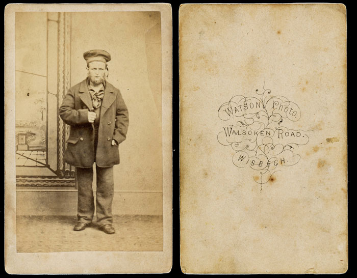 Subjects, styles, advertising, other relevant information: The carte de visite below is the only image, seen to date, by a photographer, surname Watson, from Walsoken Road Wisbech. Currently nothing further is known of this photographer. The carte de visite is probably from the 1860s and is a full length portrait of a British navy sailor wearing a pea jacket. The reverse of the carte has a scroll design with the information "Watson Photo Walsoken Road Wisbech". The subject is posed in front of a distinctive painted backdrop with a part view of a garden scene, surrounded by a painted, rather unrealistic looking, heavy frame. Along the bottom of the backdrop is a skirting board about a foot tall.